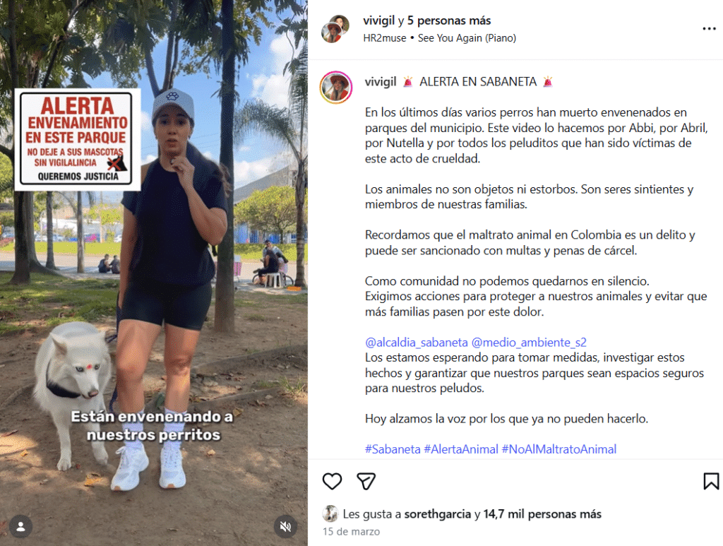 Comunidad de Sabaneta reclama respuestas tras los casos reportados de mascotas muertas. Captura de imagen tomada del perfil de Instagram @vivigil