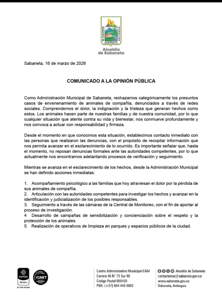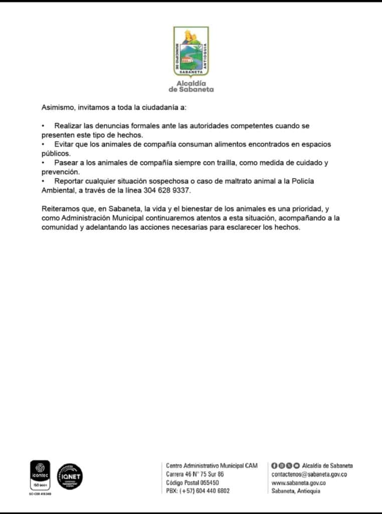 Comunicado de la Alcaldía de Sabaneta, ante las denuncias de envenenamiento de mascotas en el municipio.