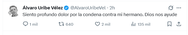 Tras conocerse el fallo, el expresidente Álvaro Uribe expresó en su cuenta de X su disgusto por la condena que impuso una pena de 28 años y 3 meses a su hermano, señalando: “Siento profundo dolor por la condena contra mi hermano. Dios nos ayude”.