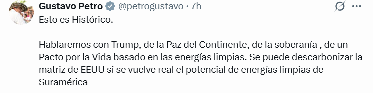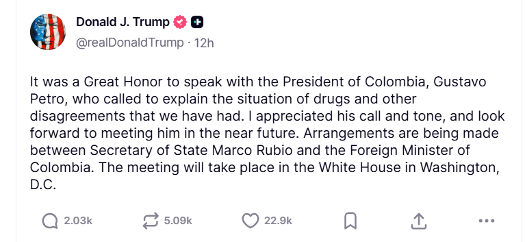 Trump publicó en su red social que: “fue un gran honor hablar con el presidente de Colombia, Gustavo Petro, quien llamó para explicar la situación de las drogas y otros desacuerdos que hemos tenido”. Añadió que “agradecí su llamada y su tono, y espero reunirme con él en un futuro cercano”, y señaló que estaban haciendo arreglos para que la reunión se realizara en la Casa Blanca en Washington.